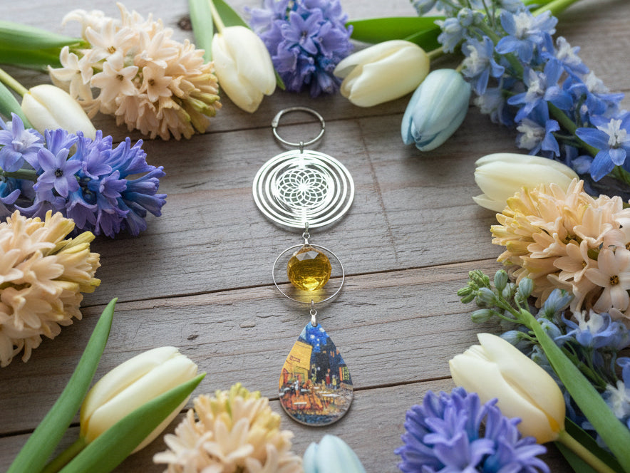 SunCatcher with wood teardrop Van Gough Cafe image/champagne crystal ball prism/stainless steel precision cut connector