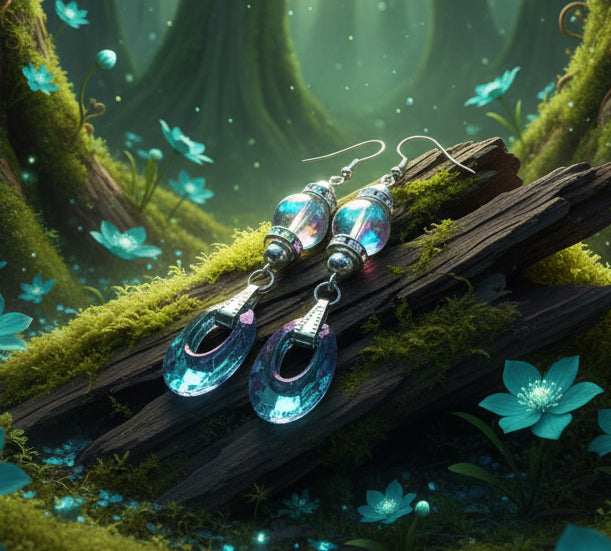 Teal/Pink Light-Reflecting Prism Earrings with Mermaid Glass Beads